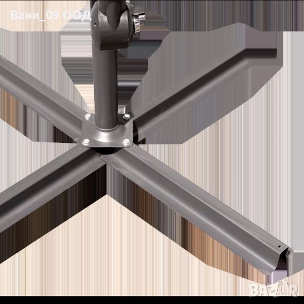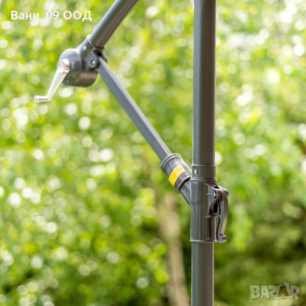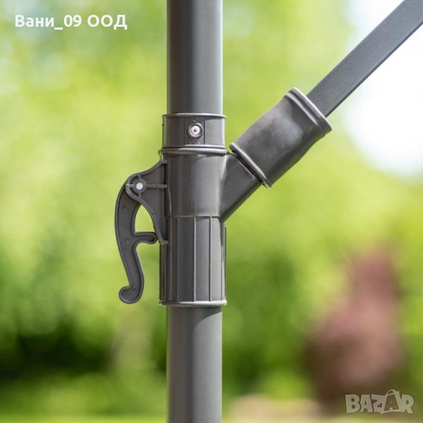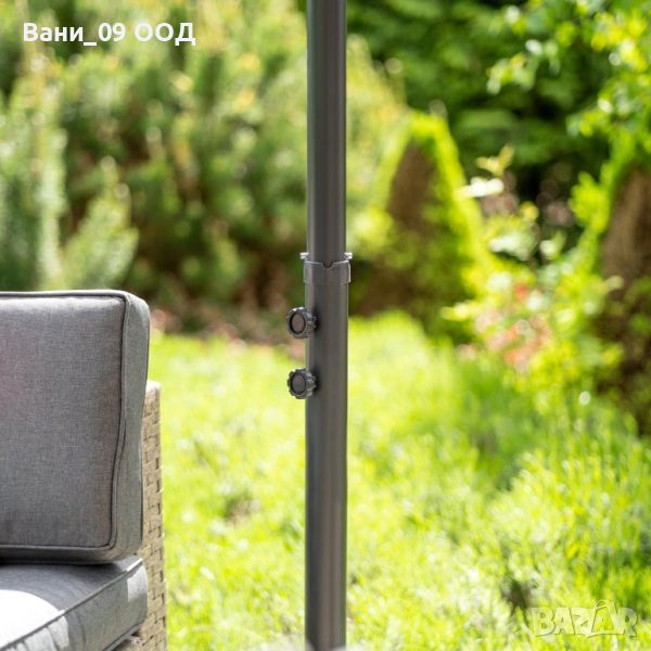 чадър с диаметър 3 метра, който ще бъде перфектен в градината и на терасата. Страничната структура в съчетание с голямата повърхност позволяват засенчване на по-голяма площ в зоната за релакс. Стоманената конструкция е солидна, така че чадърът ще издържи дълго време.