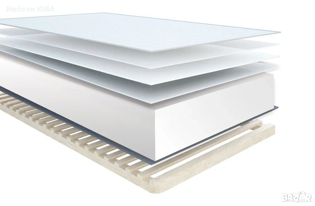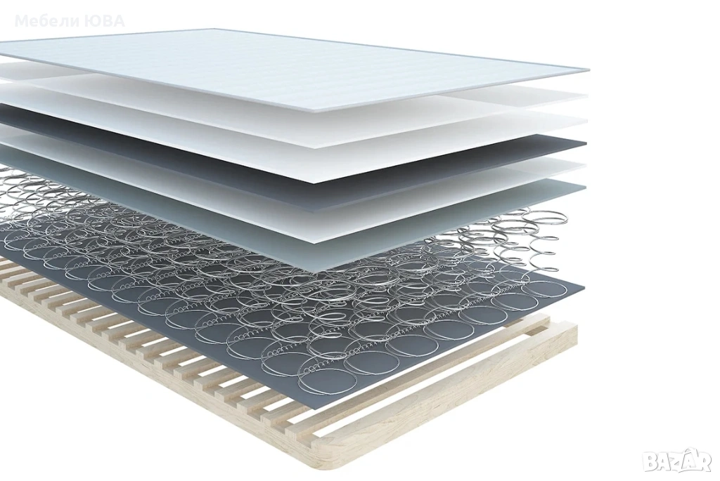 Модел Бонел - Съдържание - рамка от иглолистен материал с ламелна скара;слой обезшумяващ филц;пружинен пакет БОНЕЛ,произведен по швейцарска технология;слой от термослепени памучни влакна;„SPUNBOND“;тапицерска обемна вата;тъкана дамаска височина на матрака 22 см Модел Полиуретан