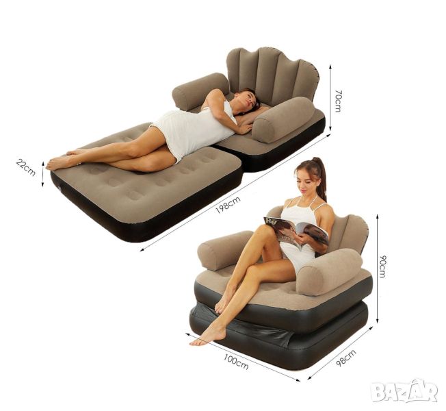 Многофункционален дизайн: Надуваемия мебел предлага пет различни функции в едно, като ще можете да го ползвате като диван, стол, фотьойл, легло и др.