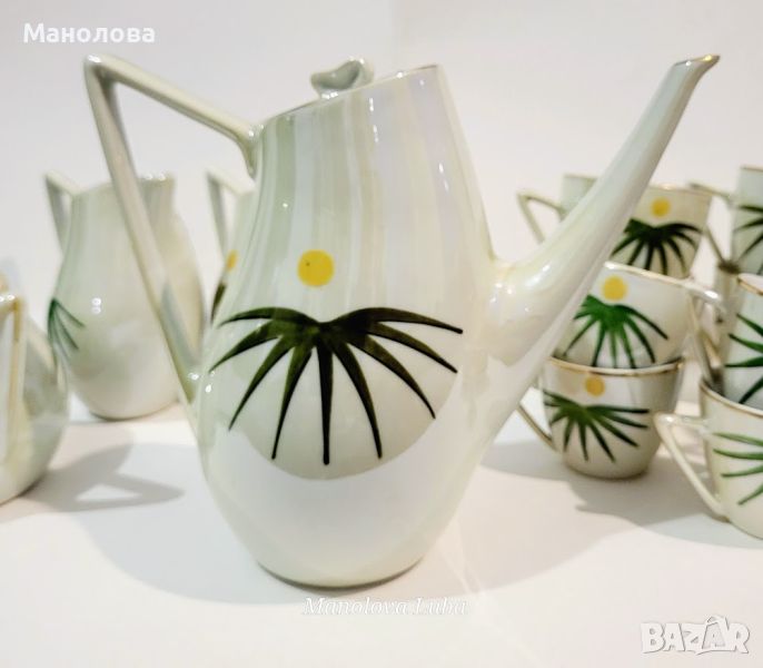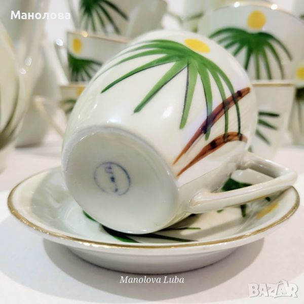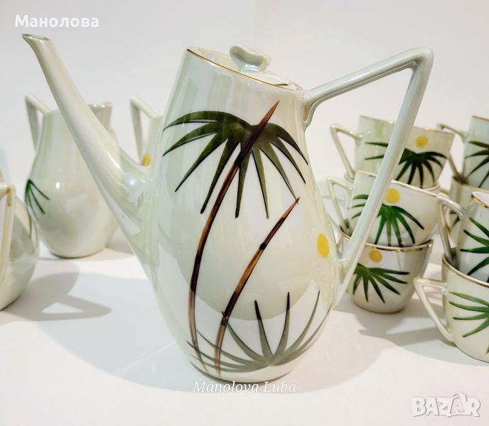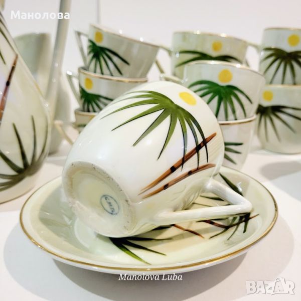 Ръчно рисуван, цял витринен сервиз за кафе и чай с кана, две латиери и захарница в стил art deco. Порцелана е с кремав цвят и е с перлено покритие. Декора е палми, емблематичен за фабриката. Произведен 60те години на миналия век, няма следи от употреба! Забележка/ моля погледнете последните две снимки/ малък чип на едната чаша за чай и пукнатина на чинийката, която не нарушава целостта и.