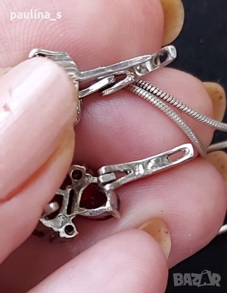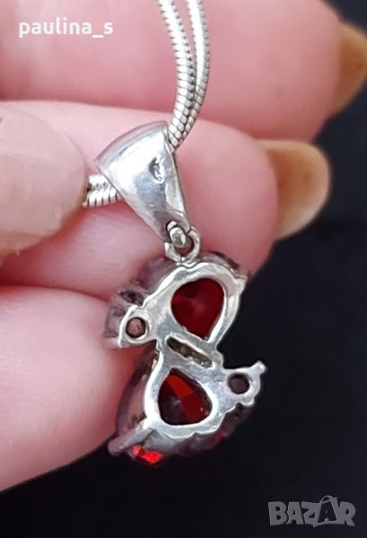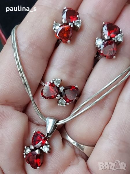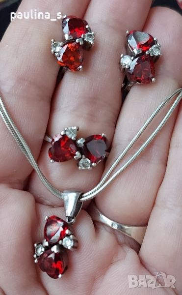 гранати. Цената е крайна, без пазарлъци 150 евро. Камъните са шлифовани във форма на сърце, по два на всеки артикул. Белите камъни са циркони. Пръстенът е размер 18мм, мащабирането е на дланта. Камерата не може да улови красотата на бижутата. Семейни бижута, комплектът не се дели и не се продава на грамаж!