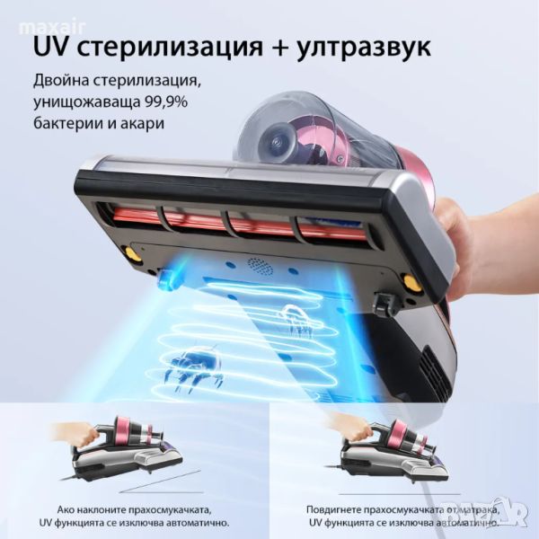 Благодарение на иновативната технология за UV стерилизация, BX7 Pro елиминира прах, акари и бактерии в дълбочина. Прахосмукачката излъчва ултравиолетови вълни с дължина от 253 nm, които унищожават 99,99% от праховите акари.