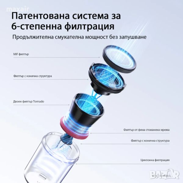 Благодарение на 6-степенна система за филтрация с технология циклон, прахът и твърдите частиците ефективно биват отделени от въздуха. По този начин се гарантира непрекъсната силна всмукателна мощност на прахосмукачката, както и здравословна среда в дома ви, без възможност от вторично замърсяване и симптоми на алергии.