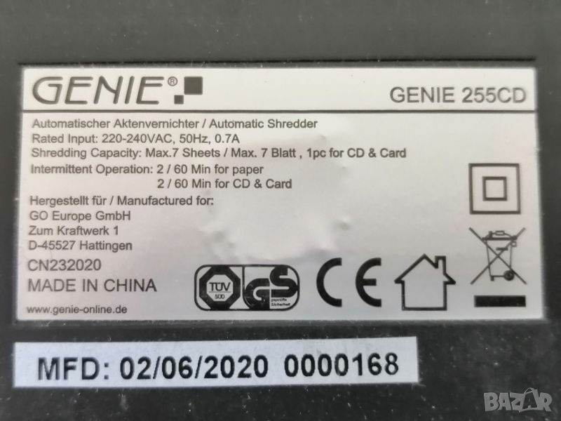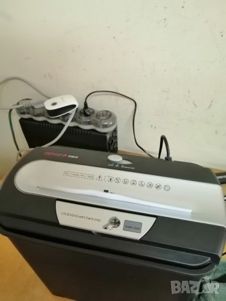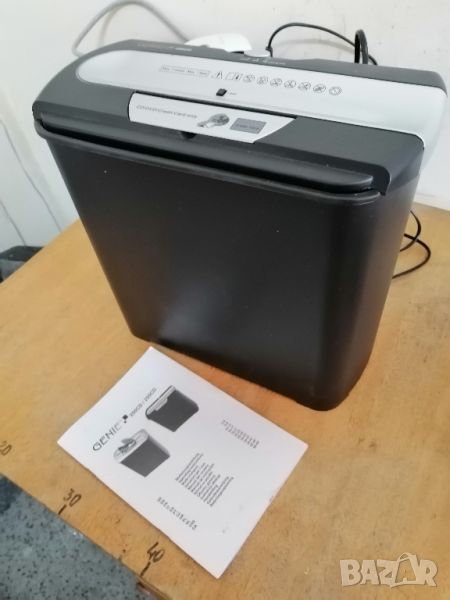 Шредер за документи Genie, 255 CD DIN P/1, 12 лGENIE 255 CD, шредер, ниво на защита P-1, рязане на ленти, 7 листаШредер за рязане на частици за 7 листа A4, идеален за по-малки офис средиХартията се поставя на прибл. 7 mm ленти, нарязани с ниво на безопасност P-1Време на работа 2 минути, със защита от претоварване и старт-стоп функцияТехнология против засядане на хартия благодарение на функцията за ръчно обръщанеКошче за отпадъци с обем 12 литраШредера е донесен от Германия и е буквално като нов.