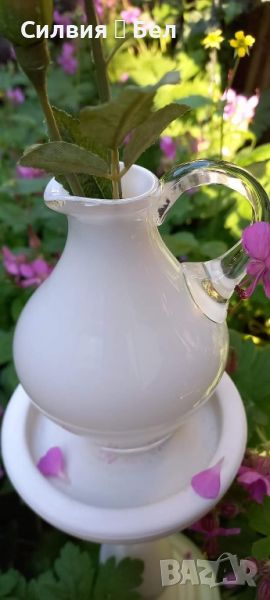 Бяла МАЛКА ваза с безцветна дръжка, обагрена в млечно бял цвят. Полско художествено стъкло от стъкларската фабрика "Tarnowiec" от 70-те и 80-те години на миналия век, проектирано от Jerzy Słuczan - Orkusz.