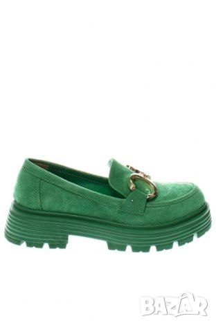 Естествен велур .отвън отвътре еко кожа прекрасен зелен цвят ( много актуален модел със златна тока ) Обувала съм ги само в къщи но за жалост са ми малки .Стелката им е 24 см тока 5 см на платформа стабилна .Без кутия се продават .КРАЙНА ЦЕНА БАРТЕРИ НЕ МЕ ИНТЕРЕСУВАТ