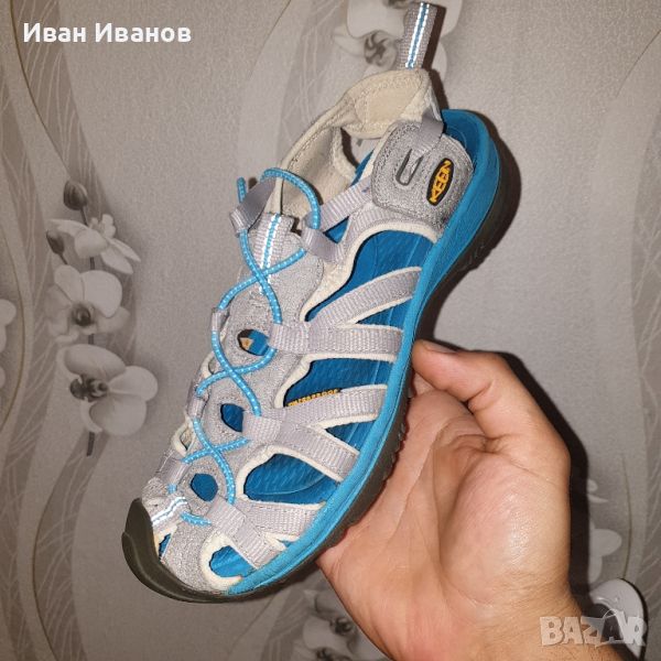 Keen Whisper W Дамски сандали номер 39,5Много малко използвани , без следи и забележки . Красиви , леки , удобни .Малко използвани ,Без следи и забележкидължина на стелката 24,6 см .Дамските спортни сандали KEEN WHISPER са с тясна, специфична за дамските крака форма, с удобна защита за пръстите и с гумена стелка, която е обработена с натурално антибактериалната технология Cleansport NXT. Горната част на сандалите е произведена от текстил. Подходящи са за спортуване, за туризъм, за водни спортове и за свободното време. Стягат се със специална система с връзки. Универсален модел за туризъм, за излети сред природата и за разходки в града.защита на пръститетясна формабързо и лесно стягане със специална системаподходящи за излети сред природата, за разходки в града и за водни спортовеKeen Whisper - черни и сиви дамски сандалиНад хълма и долината със сандалите Keen Whisper: трекинг моделът прави почти всичко и ви придружава през лятото. Сандалите се отварят и затварят лесно благодарение на системата за бързо завързване с гумена корда. В допълнение, те предлагат удобно, но сигурно прилягане.Перещият се външен материал и подплата от полиестер са водоотблъскващи и бързосъхнещи, както и антимикробно третирани. Предварително оформената EVA подложка с вградена подложка осигурява на краката ви максимален комфорт.Областта на пръстите е подсилена, за да можете безопасно да се справяте с всеки терен. Сандалите Keen Whisper успяват да балансират между ефирен комфорт и сигурна опора на стъпалото и опората на свода. След като се пъхнете в обувката си за нула време благодарение на двете примки, забавлението може да започне - цветовата гама черно/неутрално сиво върви с всеки ваш тоалет.информация за продуктаДамски сандалиПереща се горна част от полиестерна тъканВодоотблъскваща мрежеста подплатаустойчива на абразия, неплъзгаща се гумена подметкаомекотяваща EVA междинна подметкаергономично оформена подложкаТегло: приблизително 250 g на обувкаВложка за лента за стабилизиране на петатаеластична система за бързо връзванеХалки на петата и езика за бързо обуване и събуванеподсилена зона на пръститеантимикробно третираниКомпанията Keen е основана през2004 г в САЩ. Тя отваря собствена фабрика в Портланд, Орегон. Произвежда висококачествени модели обувки,при чието производство се опитва да опазва околната среда. Използва своя ценен опит в дъщерното си дружество Keen, което създава в Европа през 2015 г. Keen скоро се превъща в популярна марка трекинг обувки.Компанията произвежда обувки за всички хора, които обичат активния начин на живот.Всяка година в региона на ЕМЕА (Европа, Близкия изток и Африка) се внасят огромно количество обувки, което е много важен фактор за растежа на Keen.Генералният мениджър на Keen Джон Янсен е привърженик на идеята, че марката непрекъснато ще се развива, което означава за клиентите, че обувките ще се изработват от все по-добри материали, сроковете за доставка ще бъдат минимални, а марката ще бъде в крак с модните тенденции.Качеството на обувките, разбира се, се крие в производствената технология. Основният принцип на производство е така нареченият процес на директно впръскване. Това е специализиран и сложен процес, който се използва от самото начало на производството на тази марка. Производството свежда до минимум въздействието върху околната среда чрез използване на високо 