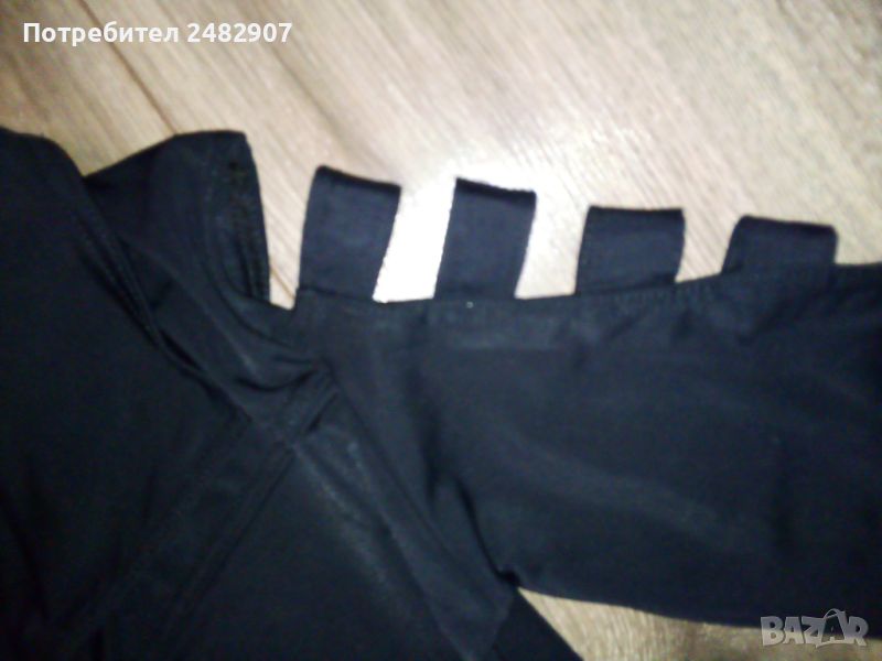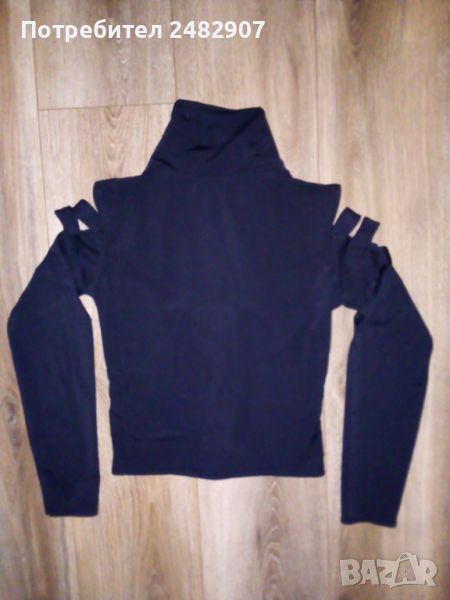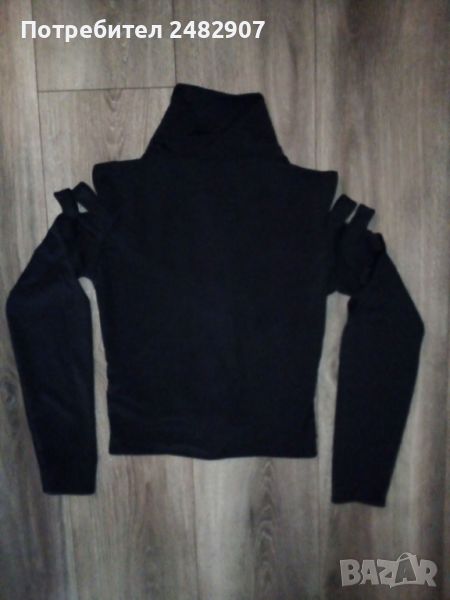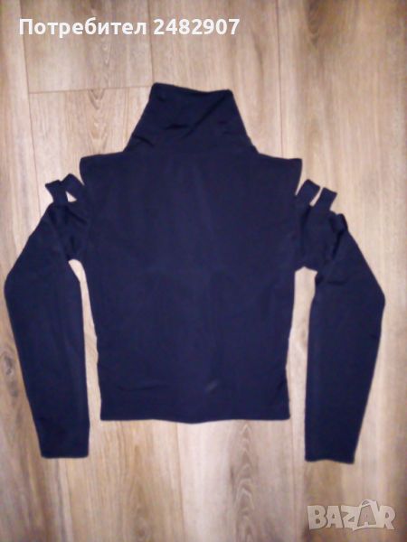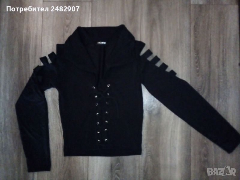 Черна дамска блуза с връзки, яка и ефектни ръкави, размер S. Съдържа 82 % найлон и 18 % еластан. Ширина в раменете - 36 см, ширина под мишниците - 39 см, ширина в долната част - 31 см, дължина от рамото до долу - 45 см, дължина на ръкава от рамото - 52 см, ширина на ръкава в долната част - 9 см. Обличана веднъж за повод, отлично състояние, без забележки.