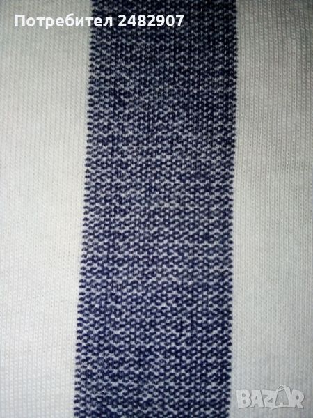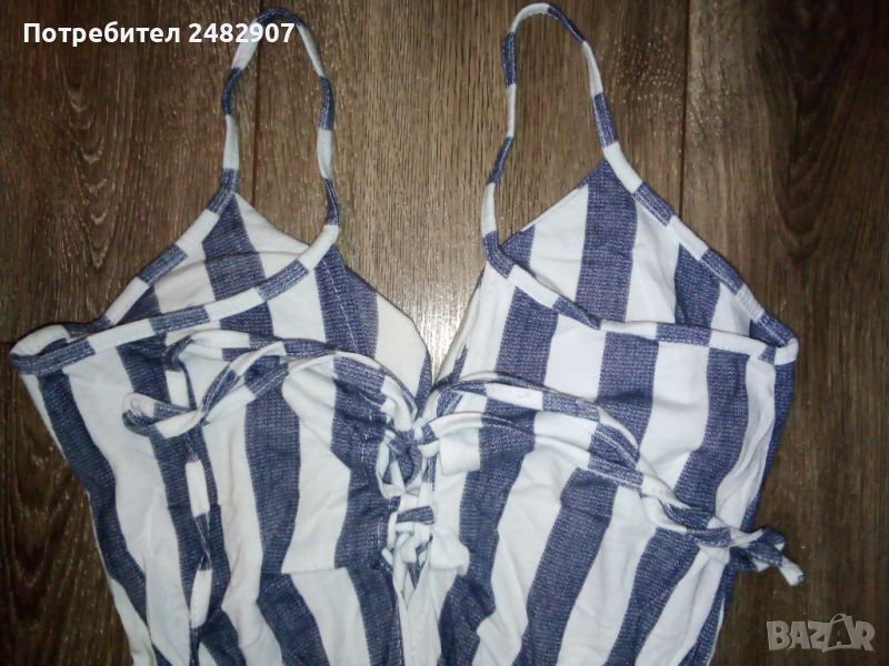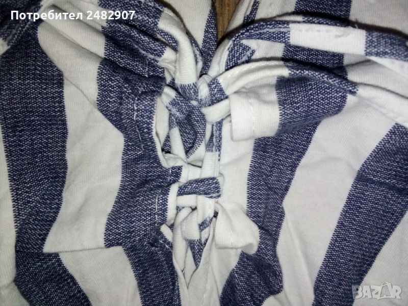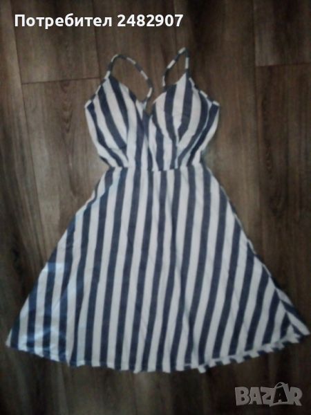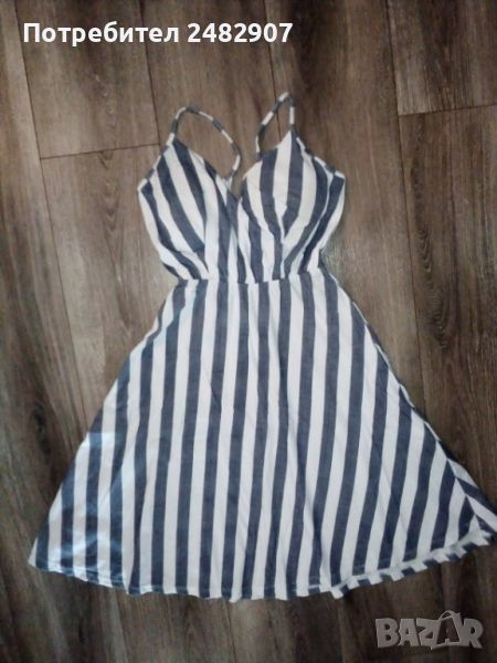 Памучна дамска рокля в бяло и синьо с презрамки и ефектен гръб с връзки. Съдържа 95 % памук и 5 % еластан. Ширина под мишниците - 40 см, ширина в талията (на ластик е) - 26 см, ширина в долната част - 95 см, дължина от горната част на презрамката до долу - 90 см. Много запазена, почти не е използвана, без забележки.