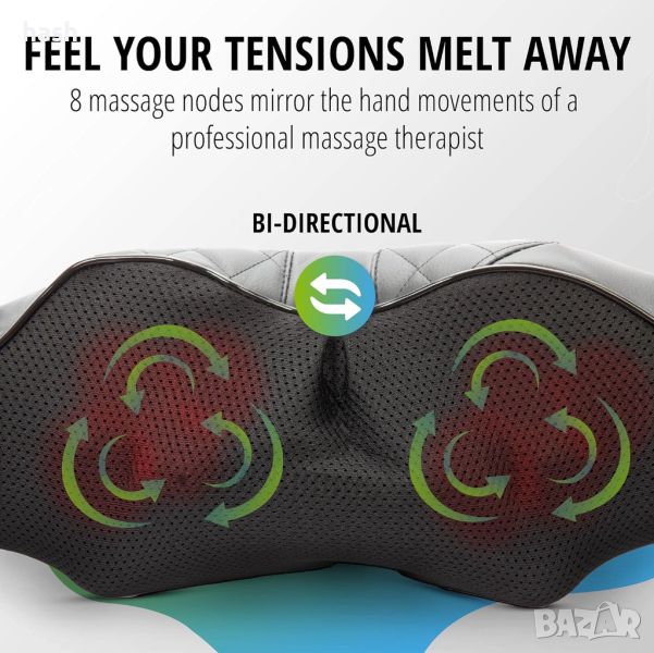 - 8 масажни топки - Възли (4 големи и 4 малки), които се месят в дълбочина, се усещат почти като ръцете на професионален масажист. Независимо дали имате нужда от релаксиращ и успокояващ масаж или по-дълбок спортен масаж за облекчаване на мускулното напрежение, този преносим масажор незабавно успокоява болките и възпалените мускули.