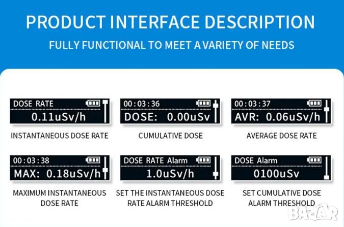 * Четири режима на показване: Моментна доза, Средна доза, Кумулативна доза и Пикова мощност на дозата