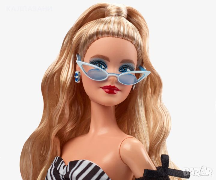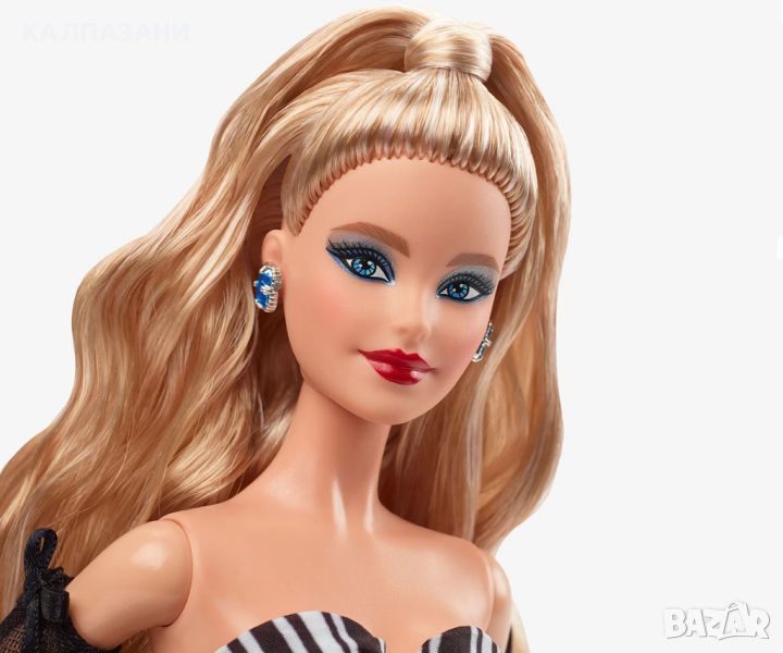 Тази бляскава кукла Барби отбелязва 65-годишнината на Барби по зашеметяващ начин. Нейният невероятен външен вид е пропит с прекрасни детайли от главата до петите, които напомнят за оригиналната кукла Барби. Визия в черно и бяло с изпъкнали сапфирени цветове, тя е задължителна за колекционери, любители на Барби и фенове на модата по целия свят. Включва стойка за кукли и сертификат за автентичност. Куклата Barbie® не може да стои сама. Цветовете и декорациите могат да варират.