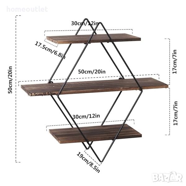 Тази стенна етажерка с форма на диамант е предназначена както за декоративно, така и за функционално съхранение и със сигурност ще привлече вниманието, където и да бъде поставена. Изработена е от масивна борова дървесина и прахово боядисана желязна рамка.