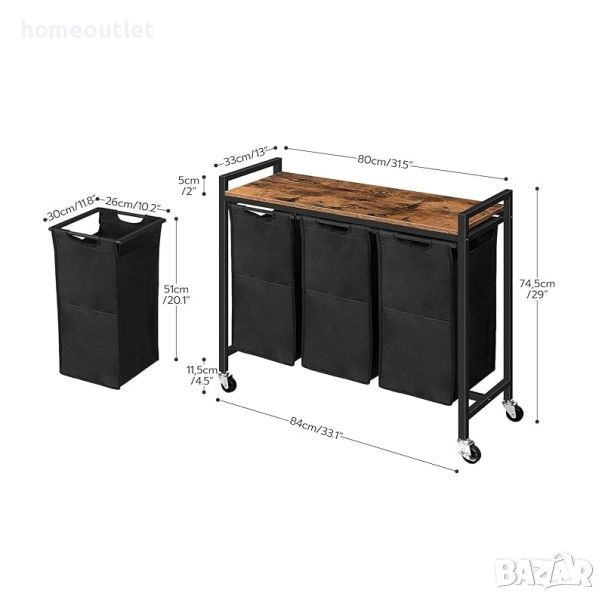 Всяка торба за пране е с размери 26 см Ш x 30 см Д x 51 см