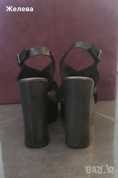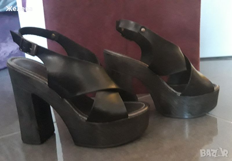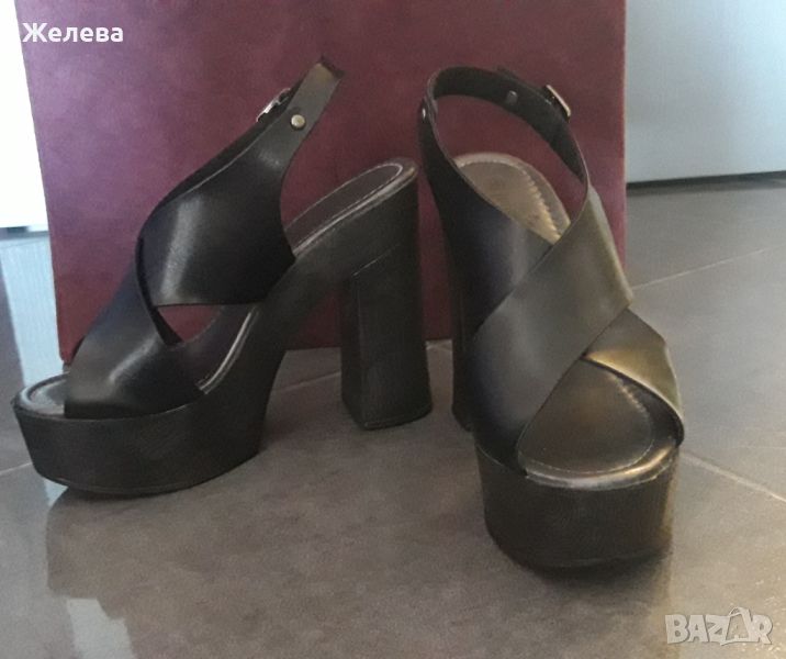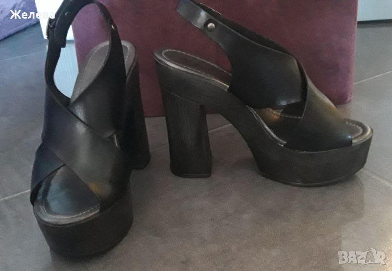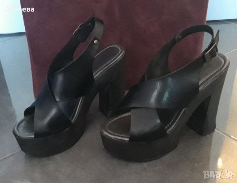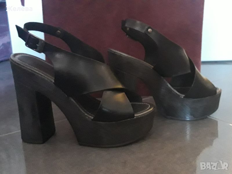 Дамски черни сандали с висок, дебел ток и платформа-естествена кожа. Отлично състояние.