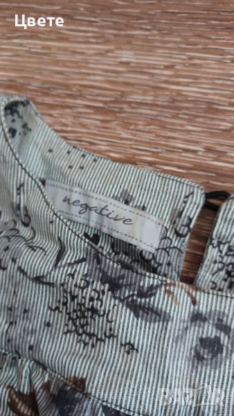 Роклята е на фирма Негатив, с волани, закопчаване е малко копченце на врата, слагана два-три пъти, като нова, без никакви забележки по нея
