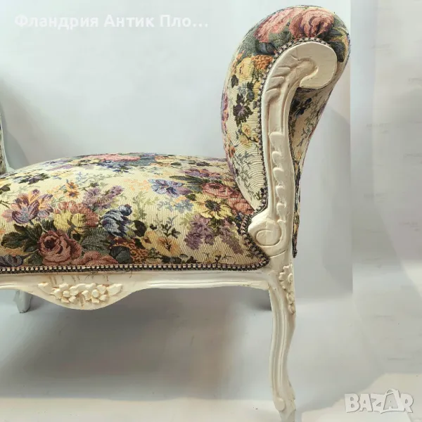 С високи тапицирани подлакътници и дамаска в светъл цвят с десен английски рози, тя носи усещане за нежност и елегантност. Дървената част, боядисана в бял цвят с патина,изкуствено състарена, придава уникален винтидж чар.