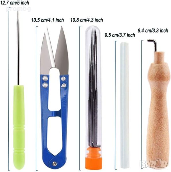 Комплектът включва инструменти в пластмасова кутия: подложка от дунапрен, дървена дръжка за плъстене, 7 игли, ножици (клъцка), шило, 2 бр. кожен напръстник, лепилна пръчка, комплекти пластмасови пирончета, връзка.