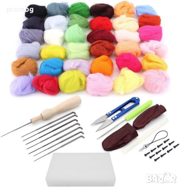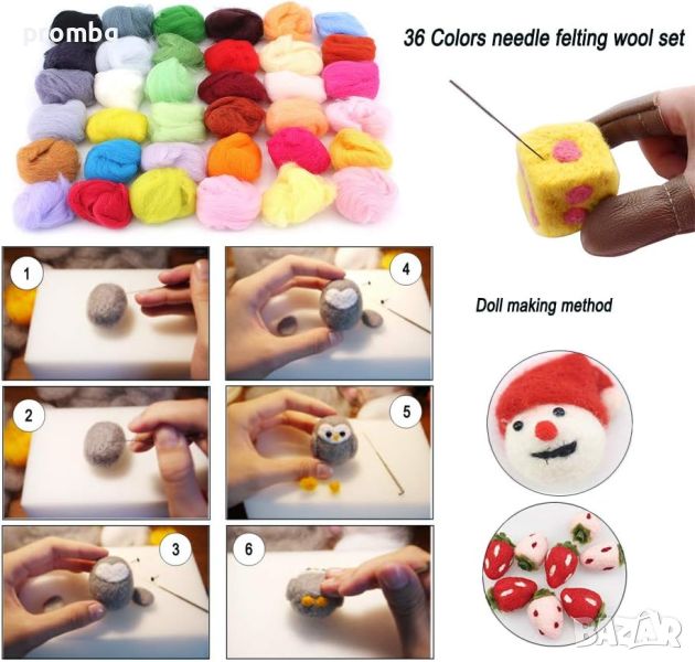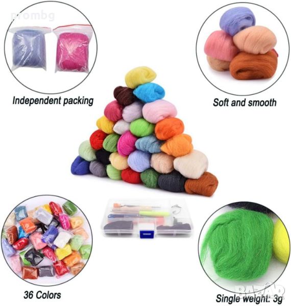 Хоби комплект с 36 бр. вълнените ролки за плъстене. Изработени са от висококачествени естествени вълнени влакна, много меки и без бучки, които ви осигуряват комфорт при докосване, голяма пластичност. Подходящи за изработка на играчки, изкуства, занаяти, бижута, изработка на кукли, топки за сушене и др.