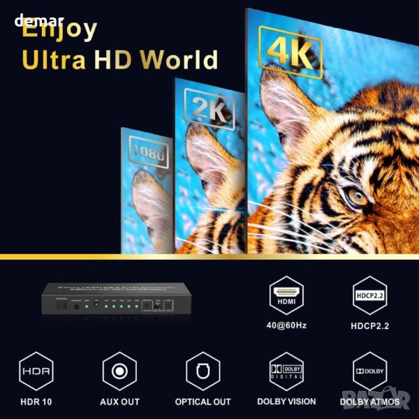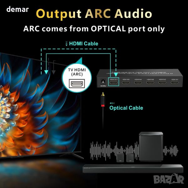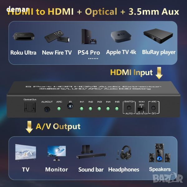 Този HDMI Switch Audio Extractor свързва до 5 източника (компютър, кабелна кутия, игрови конзоли, Fire TV, Chromecast 4K, Apple TV 4K, Blu-ray плейър) към един HDMI порт на вашия HDTV, монитор или проектор. Той извлича аудио от HDMI и извежда чрез оптичен и 3,5 мм жак към високоговорители, слушалки, приемници и звукови ленти. С 3 EDID аудио настройки, той поддържа 2CH LPCM/PCM стерео, 5.1CH Dolby Digital/DTS и Dolby HD/DTS HD/Dolby Atmos. Устройството поддържа 4K@60Hz, 1080P@120Hz, HDR10, Dolby Vision и 18Gbps предаване. Функцията ARC изпраща телевизионно аудио към системи, различни от ARC, чрез оптични и HDMI портове (не 3,5 мм жак). Лесно превключване между устройства с автоматични и ръчни опции; автоматичното превключване може да бъде деактивирано. Пакетът включва HDMI Switch Audio Extractor, IR дистанционно, захранващ адаптер и ръководство за потребителя.