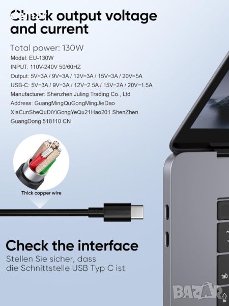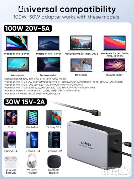 100W USB-C зарядно устройство предлага високоефективно бързо зареждане с мощност от 100W и допълнителен 30W USB-C порт, осигуряващ бързо, стабилно и преносимо зареждане за лаптопи, таблети и телефони. Той поддържа широка гама от устройства, включително MacBook Pro, MacBook Air, iPad Pro, iPad Air и различни USB-C лаптопи като ThinkPad, Yoga, Asus ZenBook, HP Spectre, Dell XPS, Xiaomi Air, Acer, Huawei MateBook и Thunderbolt 3 устройства. Зарядното устройство гарантира безопасност и надеждност с професионални технически прегледи, предотвратяващи прегряване, грешки в напрежението и късо съединение. Вход: AC 110-240V, 1.5A, 50-60Hz; 100 W изход: 5V-3A/9V-3A/12V-3A/15V-3A/20V-5A 30W USB-C изход: 5V-3A/9V-3A/12V-2.5A/15V-2A/20V-1.5A