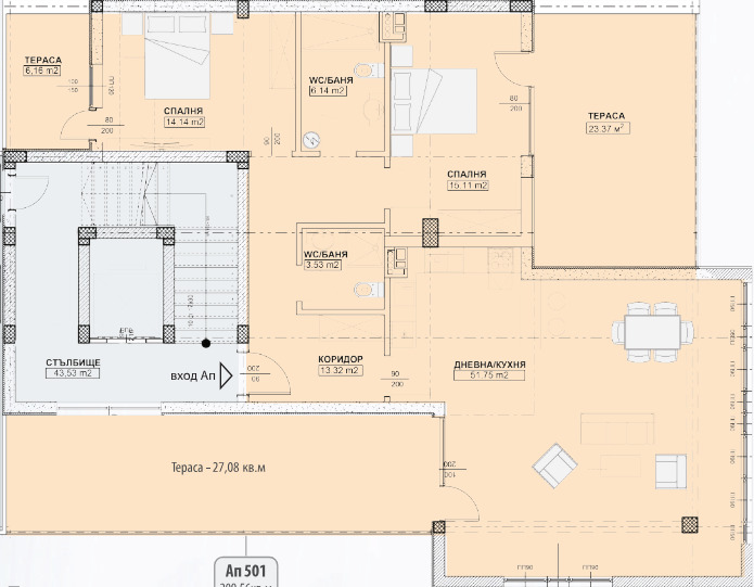 Апартамент 501 е ситуиран на 5-ти жилищен етаж и разполага със застроена площ от 130 кв.м., разгърната по следния практичен начин: антре, дневна с трапезария и кухненски бокс, 2 спални, 2 бани с тоалетна, 3 тераси. Жилището се предлага на шпакловка и замазка, за да може Вашето въображение да го превърне в мечтания за Вас нов ДОМ!