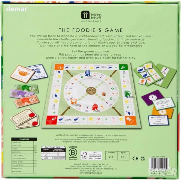 Тествайте кулинарните си познания и бъдете първият, който отвори свой собствен ресторант с The Foodies Game от Talking Tables. Тази екологична игра без пластмаса включва дървени зарове и е предназначена за 2-6 играчи на възраст над 13 години, което я прави идеална за вечер на семейна игра. Навигирайте в дъската, като изпълнявате предизвикателства и отговаряте на въпроси, за да събирате жетони и пари. Talking Tables има за цел да обедини хората, като минимизира въздействието върху околната среда. Присъединете се към забавлението и купона, сякаш има утре!