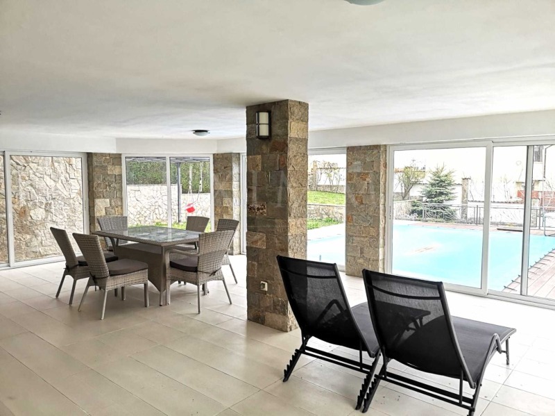 Къщата разполага с голям басейн, барбекю зона и паркоместа с навес.