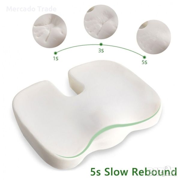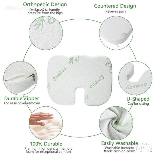Ортопедична анатомична възглавница Mercado Trade с бамбукови нишки за сядане от мемори пяна, спомага за премахване на болките в кръста, поддържа гръбнака и способства за правилна стойка. Може да се използва на стола в офиса или у дома, в колата, дори в инвалидната количка. Препоръчва се за хора, които прекарват много време в седнало положение, за предотвратяване на заболявания на гърба.