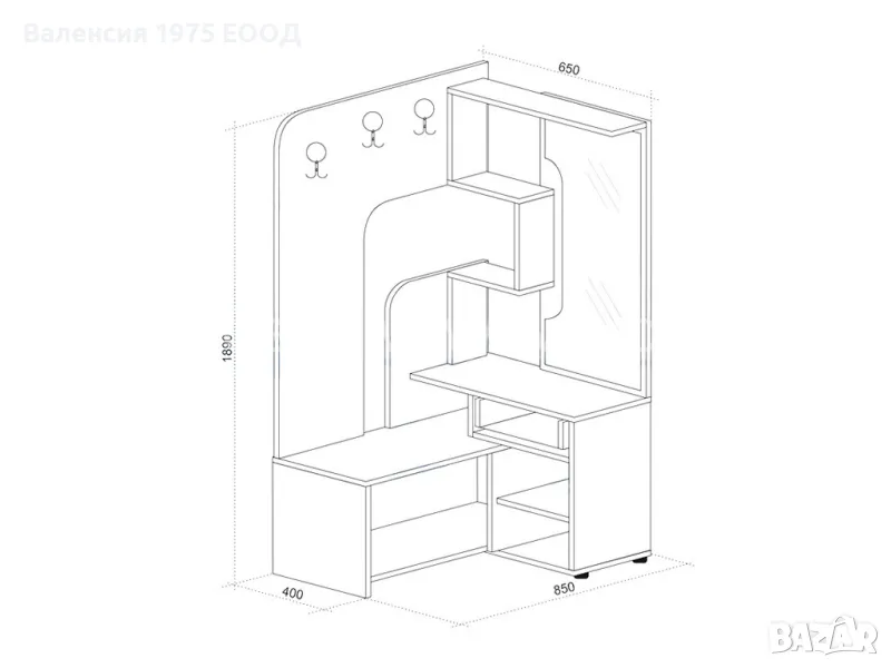 Ъглово портманто с открити рафтове, три двойни закачалки, чекмедже и огледало.