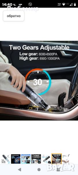 Две регулируеми предавки, ниска предавка около 6000-6500 PA, висока предавка около 8500-10000 PA. 7800 mAh (2600 mAh*3) паралелна батерия с голям капацитет и мощен мотор осигуряват на прахосмукачката за кола около 20 минути време на работа, 30m/s скорост на вятъра и 500L/min въздушен поток на висока предавка или 30 минути, скорост на вятъра 75,5 ft/s и въздушен поток от 300 l/min при ниска предавка.