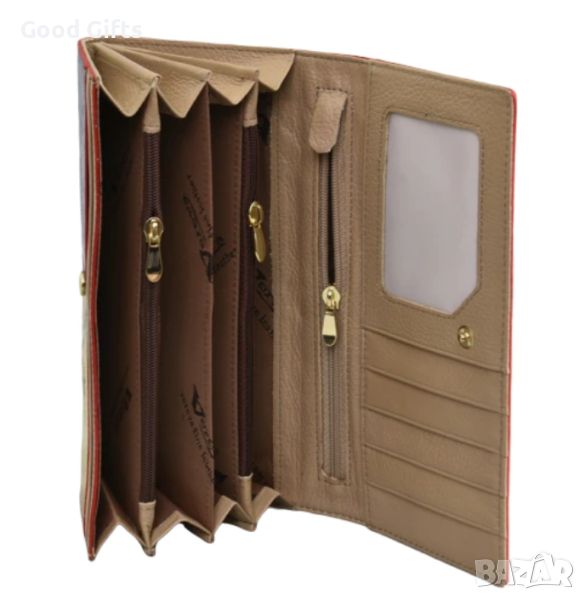 Красиво портмоне от естествена кожа, с десени от картини на Ван Гог. Портмонето е с капак, множество раздели за карти и визитки, няколко прегради за банкноти и удобни джобове с цип.
