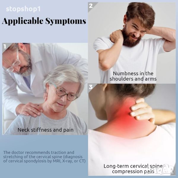 - 【Устройство, препоръчано от лекари】Това устройство се препоръчва за хора, които имат проблеми, свързани с шийните прешлени, включително цервикална спондилоза, диагностицирана чрез ЯМР, рентгенови лъчи или компютърна томография, продължителна болка от компресия на шийните прешлени, изтръпване на раменете и ръцете, ротационен замайване или слухови усещания и нужди от сцепление за кондилите на шийните прешлени без фиксация.