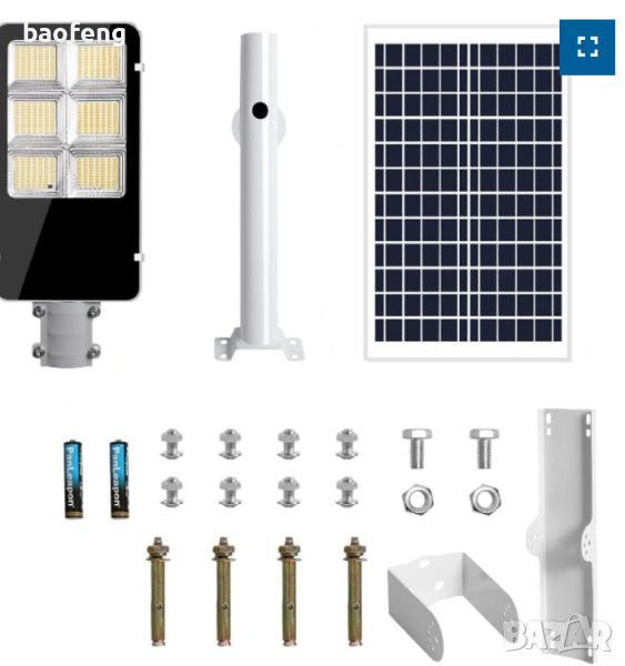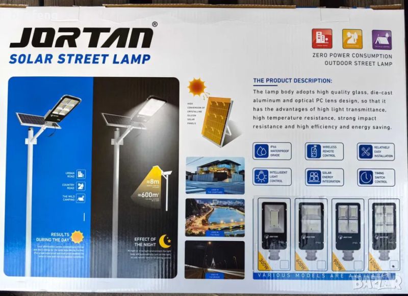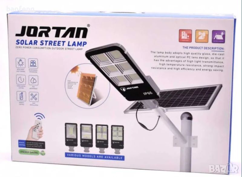 Соларна осветителна система JORTAN 400W. Състояща се от соларен панел, LED прожектор, кабели, тръба, монтажни скоби и дистанционно управление. Соларен панел 7.2V-28W. Дължина на камера от панела до прожектора 4 метра кабел, което позволя монтаж на отдалечено място спрямо прожектора. Акумулаторна батерия от 3.2V 36000mAh, захранва супер ярък бял светодиоден фенер, който осветява 6000 лумена.