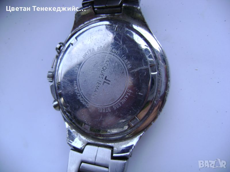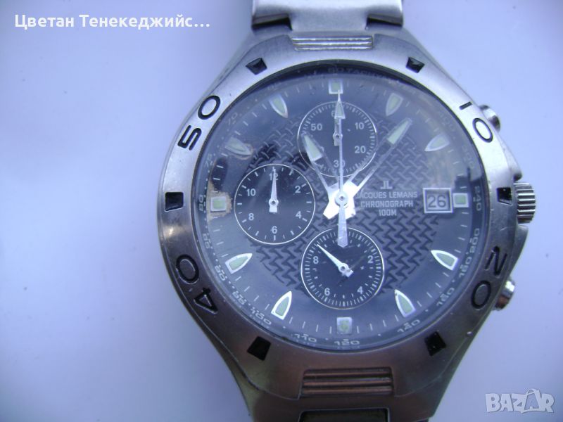 2.Кварцов часовник Jacques Lemans Chronograph.Работи точно.Датник.Всички малки стрелки са активни.Диаметър на касата без коронката 40,5мм.Фосфорни стрелки и маркери на часовете.Оригинална интегрирана метална верижка с двойно закопчаване-45лв.