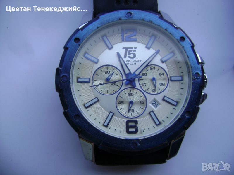 1.Кварцов часовник Т5 Chronograph.Работи точно.Всички малки стрелки са активни.Датник.Минерално стъкло.Водоустойчив 30м.Оригинална каишка от полимерен материал.Диаметър на касата без коронката 45,6мм.Фосфорни стрелки-45лв.