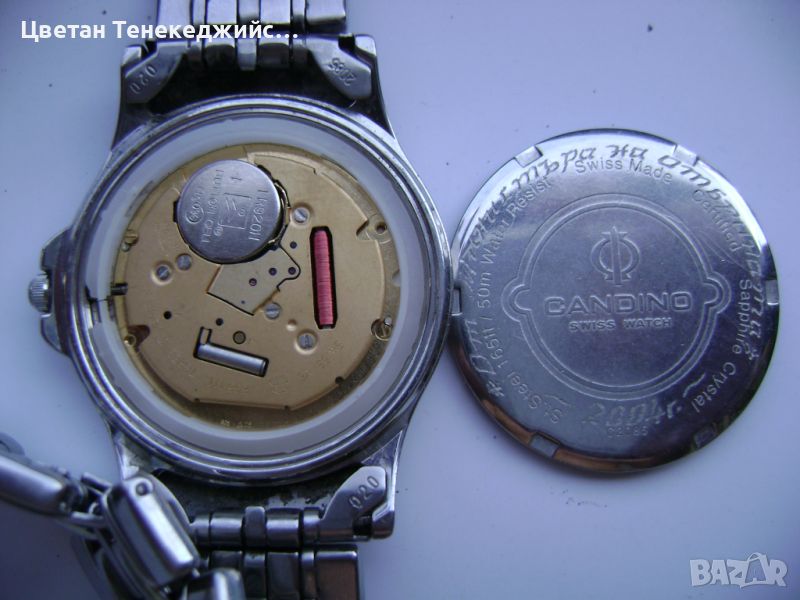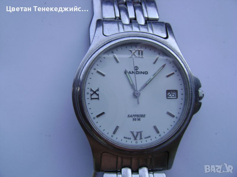 4.Швейцарски кварцов часовник Candino.Работи точно.Механизъм с 3 камъка.Водоустойчив 50м.Стъкло сапфир кристал.Оригинална метална верижка с двойно закопчаване.Диаметър на касата без коронката 35мм.-120лв.