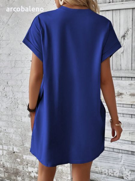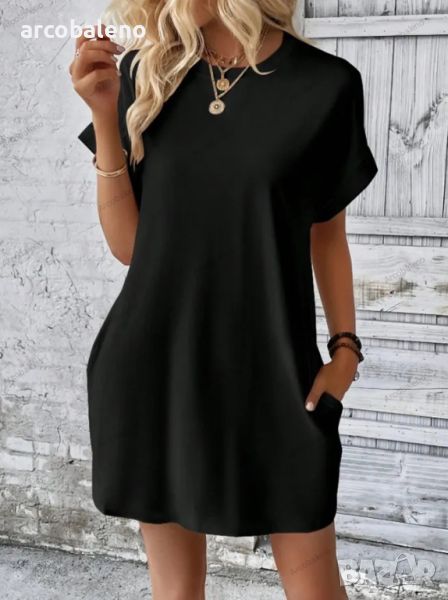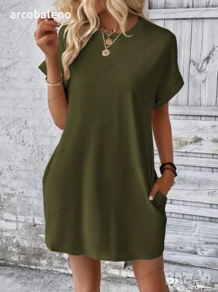 Нова пролетно-лятна едноцветна рокля с кръгло деколте и джоб с къс ръкав, 8цвята
