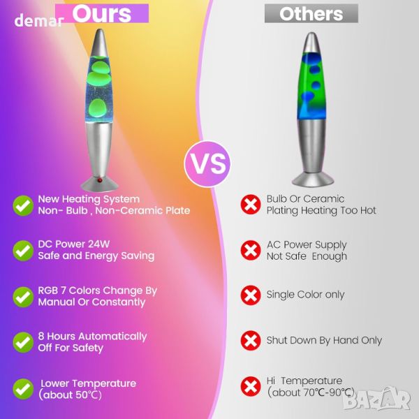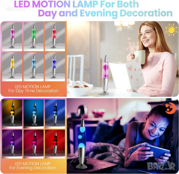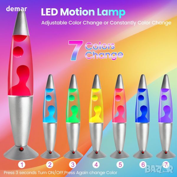 Чисто новата лава лампа, захранвана с постоянен ток, е по-безопасна алтернатива на традиционните лампи с халогенни крушки с променлив ток, включваща дълготрайна отоплителна система и LED светлини, които не се нуждаят от подмяна. Със завладяващи RGB ефекти за промяна на цвета, лампата се върти през живи нюанси и позволява избор на цвят чрез превключвател на основата. Включва 8-часова функция за автоматично изключване за пестене на енергия и безопасност. Захранван от 12V/24W DC адаптер, той е много по-безопасен и по-енергийно ефективен. Хипнотизиращият лилав/розов восък на лампата създава очарователни, постоянно променящи се форми, идеални за дневен и вечерен декор, насърчавайки вниманието и релаксацията. Съвети: Натиснете червения бутон за 3 секунди, за да включите/изключите; избягвайте разклащане или накланяне на лампата, когато се използва. Размери на продукта: 10.2D x 10.2W x 40.7H сантиметра