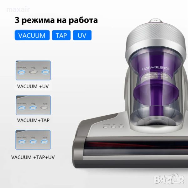 елиминира прах, акари и бактерии в дълбочина. Прахосмукачката излъчва ултравиолетови вълни с дължина от 253 nm, които унищожават 99,99% от праховите акари.