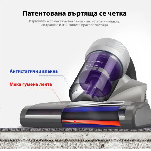 Иновативната въртяща се четка разполага с мека гумена лента и четка с антистатични влакна, а също така и възпроизвежда силни и бързи вибрации имитиращи тупане. JV35 бързо и лесно събира фин прах и прахови акари в дълбочина, без да уврежда тъканите.