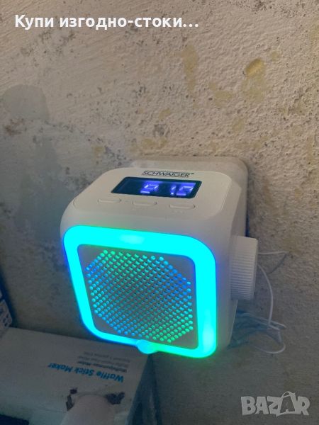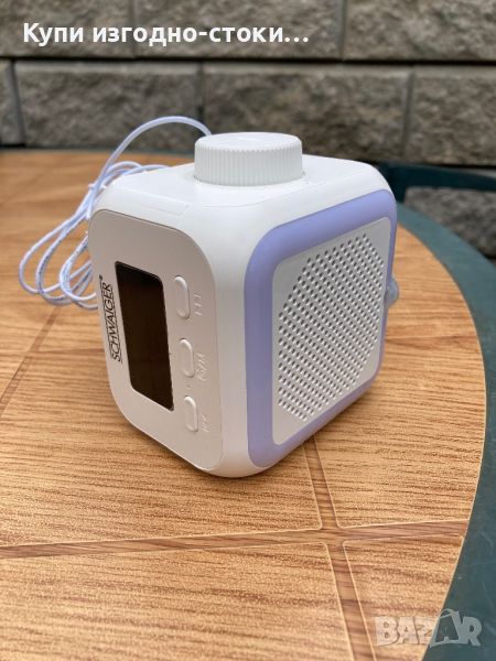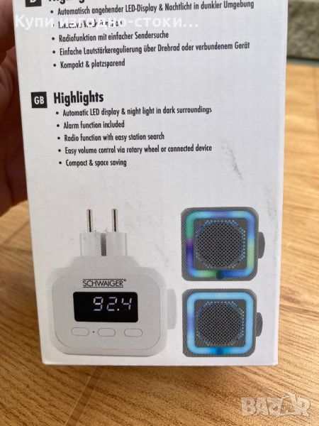 Директно се включва в контакта и не заема излишно място. Има блутут , аларма , радио , осветление в различни цветове. Звука е доста силен и чест. Чисто нови - налични 4бр Внос Германия.