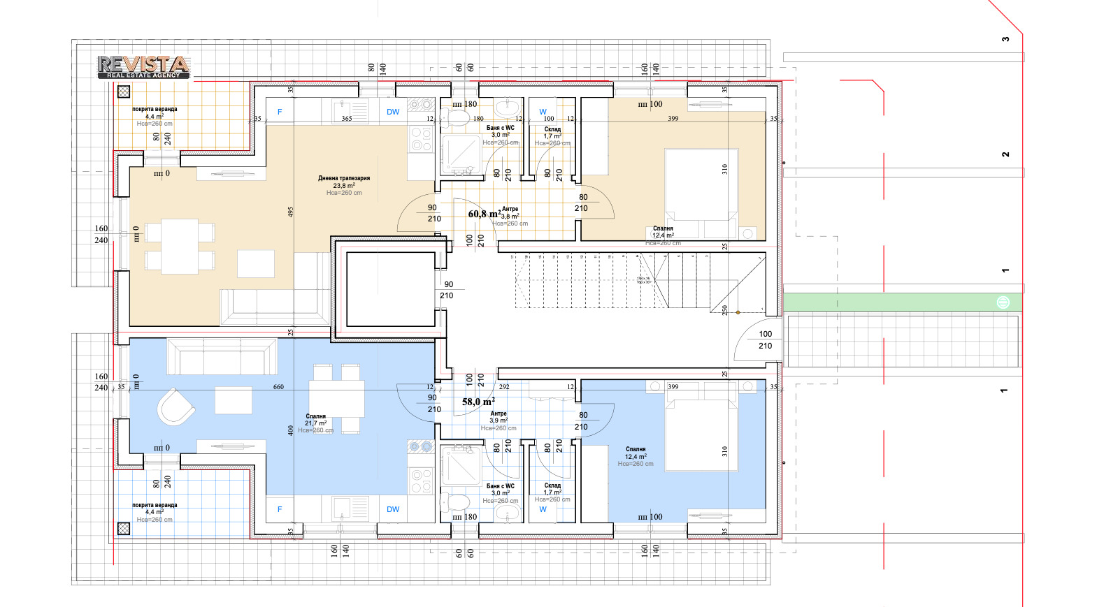 ➡️ Двустаен Апартамент, който можем да Ви предложим в комплекса, със следните основни параметри ➡️ изложение: Изток-запад, етаж: 1 от 4, застроена площ: 58,00 кв.м., общи части: 12,23 кв.м., тревна площ: 93,80 кв.м.