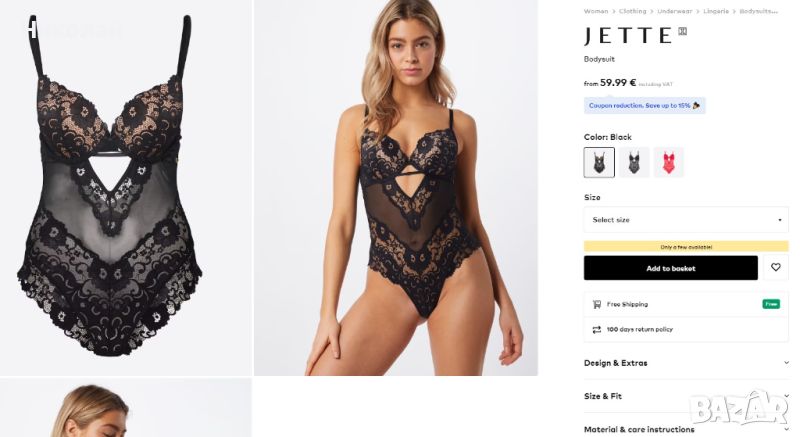 Боди от JETTE, създадено от дизайнера Jette Joop! Изработена от нежна дантела в задната част от леко прозрачна мрежа. Регулируеми презрамки и закопчаване на гърба. Може да се откачи в чатала с памучна лента за максимален комфорт. Еротично, Секси и Съблазнително бельо. Закачливо бельо. Изработен от 90% полиамид, 10% еластан