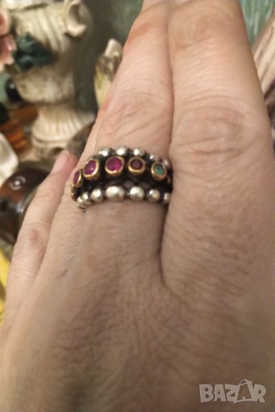 изумителен ръчно изработен пръстен с антикварна стойност ,масивно сребро ,14 каратово злато и естествени висококачествени рубини и изумруди ( единият рубин е в по червен цвят от останалите не се забелязва и е съзнателно) гледайте снимките ,размерът му е 17,4.цената не подлежи на коментар