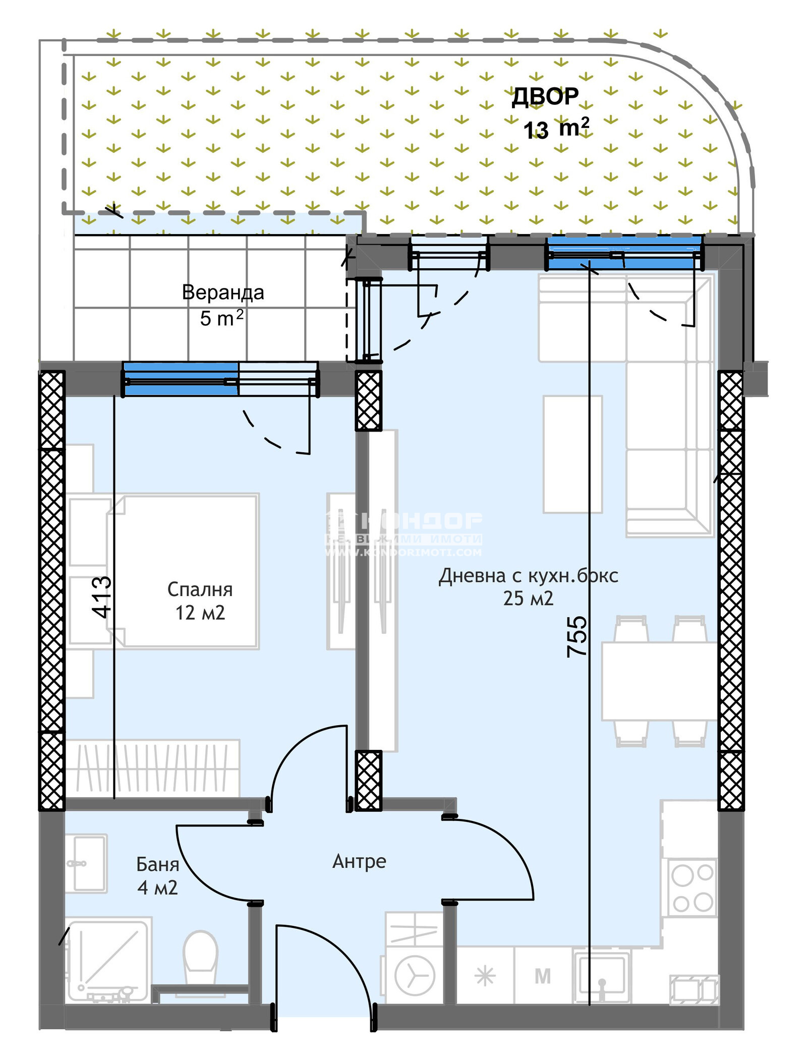 Оферта 64826: Предлагаме Ви възможността да закупите двустаен апартамент в новоизграден луксозен жилищен комплекс с модерна визия, проектиран да създаде максимален комфорт на живущите в него. Функционално разположени жилищни секции с елегантен силует готов да предложи комфорт и модерен начин на живот. Едно от основните му предимства е страхотната локация, отлична комуникативност и динамична пътна инфраструктура, която осигурява бърз и лесен достъп до комплекса от всяка точка на града. Той съчетава лукс, спокойствие и комфорт с подсигурени паркоместа и гаражи. Жилището се състои от дневна/25кв.м./ с кухненска част и трапезария, една самостоятелна спалня 12кв.м., баня с тоалетна, входно антре с място за перално, веранда и собствен двор. Към апартамента има избено помещение включено в цената. Основната концепция при проектирането е да се постигнат просторни и функционални стаи, с цел да се създаде максимален уют на модерното семейство. Изключителна съвременна архитектура и модерна технология на строителство. Визията е иновативна, привличаща внимание с уникалността си. Всяко жилище разполага с пълно окабеляване за домофон, интернет и кабелна телевизия, общите части са луксозно завършени, жилищата са с алуминиева дограма с троен стъклопакет от най-висок клас, масивна блиндирана входна врата. За удобство на живущите съществува възможността да закупят подземни паркоместа и гаражи с топла връзка към комплекса. Гъвкави схеми на разсрочено плащане спрямо възможностите на клиента в рамките на строителството или закупуване чрез Банков Кредит, на изключително изгодни условия за клиенти на агенцията !!!
