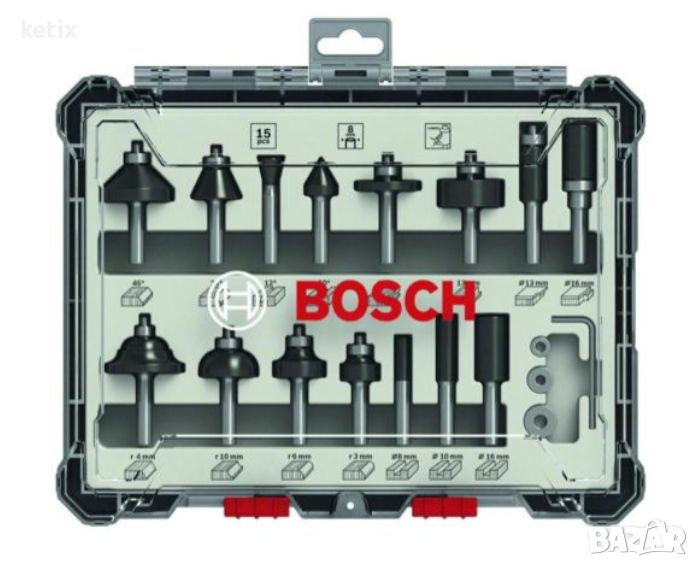 Фрезерите за оберфреза са предназначени за използване в мека дървесина, твърда дървесина и дървени композитни материали. Карбидните режещи ръбове на фрезерите осигуряват дълъг експлоатационен живот, а фрезоването на различни профили в множество разнообразни материали е възможно благодарение на различните геометрии на рязане. Наред с това те са произведени съгласно стандартите за безопасност DIN EN-847. Комплектът фрезери за оберфреза има специален дизайн Easy-Pick на отделението, което позволява бързо и безопасно вземане на фрезерите за опашката. Доставя се в специална и изключително здрава кутия, която съхранява фрезерите надеждно и сигурно, предлагайки перфектна защита на съдържанието за безопасно съхранение и транспортиране. Има прозрачно капаче за видимост на съдържанието. Смесеният комплект фрезери за оберфреза, 15 части, представлява пълен стартов комплект, който се състои от класическа селекция фрезери за оберфреза и допълнителни резервни части, като шестостенен ключ и три сачмени лагера.