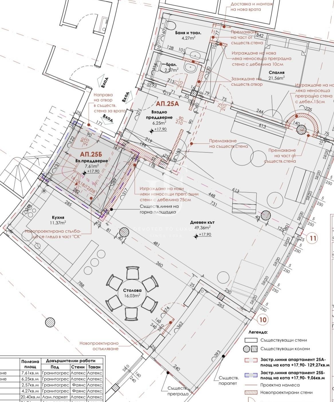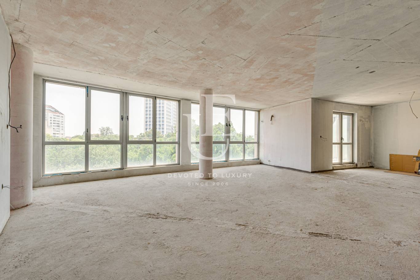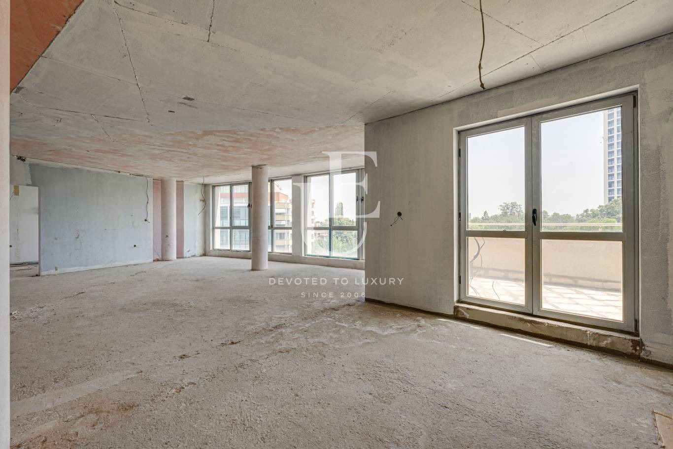 В момента представлява един огромен дневен тракт с кухня и панорамна тераса, обособена спалня с баня и тоалетна, тоалетна за гости. Но може да бъде разпределен с две спални. Ще бъде оформен и завършен до БДС според желанието на купувача, което влиза в цената.