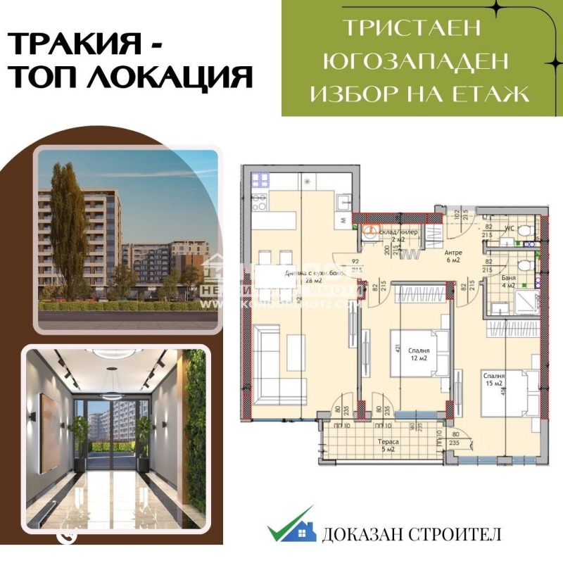Оферта 64793: Предлагаме ви възможността да закупите функционален и просторен Тристаен апартамент с югозападно изложение в един от най-обещаващите проекти за Жилищен комплекс в квартал Тракия, проектиран през последните години. Жилището се състои от дневна с трапезария и кухненски бокс - 28кв.м., две големи и непреходни спални: родителска 15кв.м., детска 12кв.м., баня с тоалетна, втора тоалетна, антре с място за вграден гардероб, килер/перално помещение и една тераса с достъп от всички стаи. При проектирането е заложено на функционални жилища с просторни стаи, високо качество на изпълнение с материали от най-висок клас, като обектът се изпълнява от една от наложилите се на пазара строителни компании с безупречен имидж. Комплексът е разположен е в самото сърце на кв. Тракия, който е с най-добре развита инфраструктура, в непосредствена близост до детски градини, училища, паркове, обществен транспорт и бърз и лесен достъп към централната част на града. Комплексът разполага с внушителните 13 700м2 вътрешен озеленен двор, в който има детски площадки, стрийт фитнес и зони за отдих. Паркоместата са обезпечени на 100%, има изградени системи за видеонаблюдение и контрол на достъп. Възможност за разсрочено плащане в рамките на строителството и разработен вариант за закупуване при клиенти с Банков кредит !!!ВИЖТЕ ОЩЕ ИЗГОДНИ ОФЕРТИ НА https://www.kondorimoti.com/ С ЕЖЕДНЕВНА АКТУАЛИЗАЦИЯ!