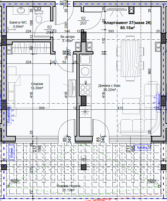 ДВУСТАЕН апартамент с площ от 100 кв. метра. Състои се от антре, всекидневна с кухненски бокс,спалня,баня с тоалетна и тераса. С изцяло източно изложение, среден апартамент. ДВУСТАЙНИЯТ апартамент ще бъде издаден в следния вид: стени и тавани шпакловка, под замазка, тераси гранитогрес, ел. инсталация до фасунга и ключ, ПВЦ дограма. Възможност за закупуване на гараж.